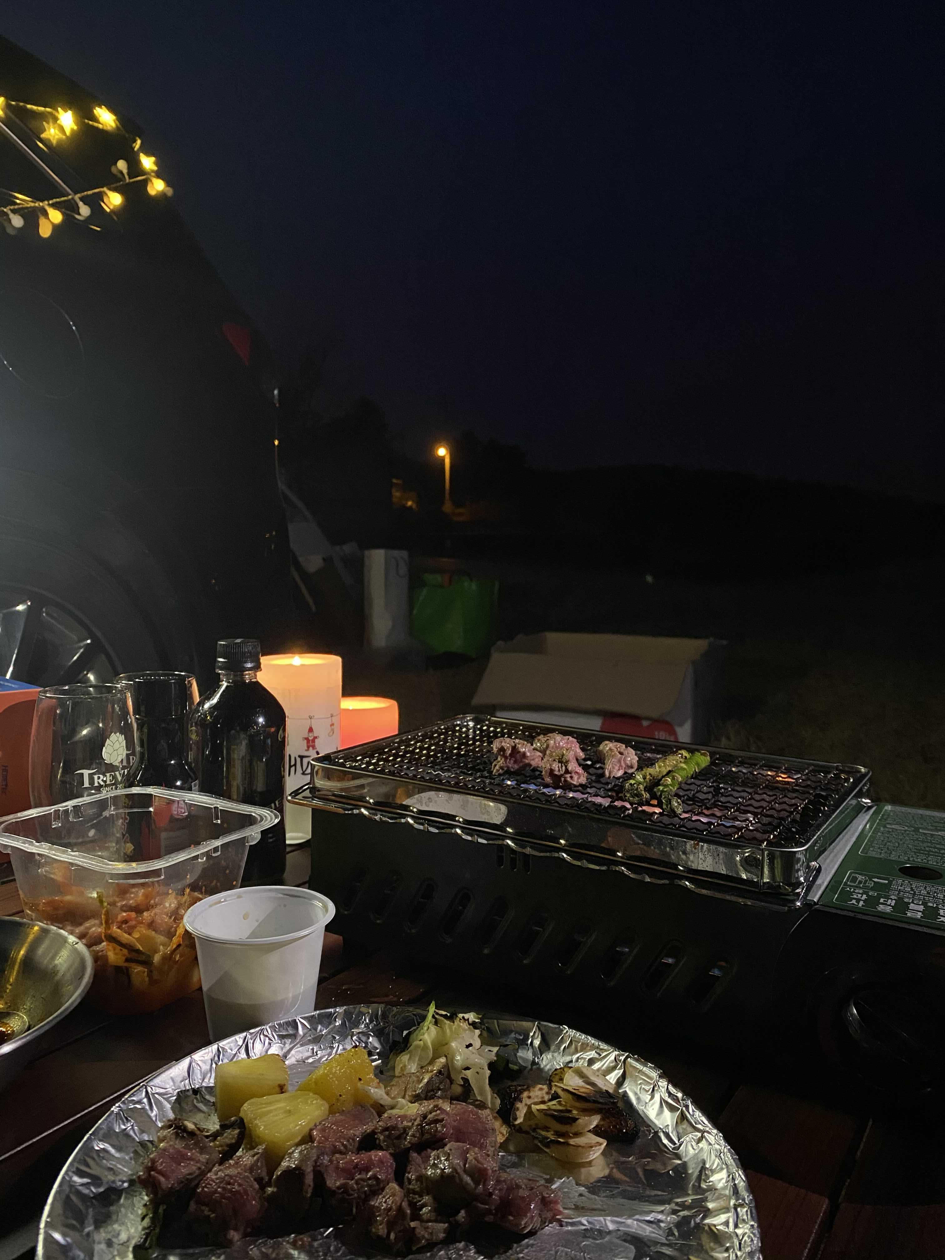 그래서 밥 다 먹고 나서 화로대 옮겨서 바다를 구경하려고 했는데. 이미 깜깜한 밤이 되었다. (ㅋㅋㅋㅋㅋㅋㅋㅋㅋ) 이 날 너무 아쉬워서 다음엔 꼭 차박하러 오자! 캠핑하자! 라고 했는데. 집에 가기 너무너무 아쉬운 밤이었다.