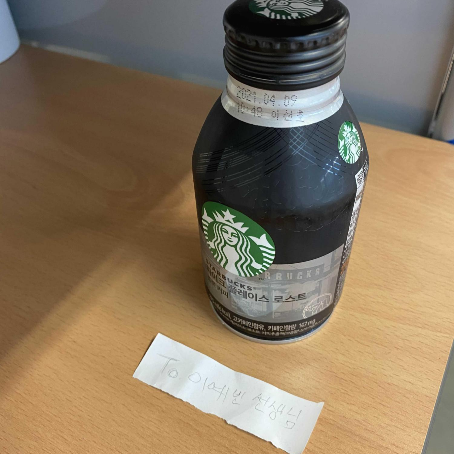 수업하러 강의실에 들어갔는데 커피를 깜빡하고 안 사서 갔지 뭐람.. 그래서 갈증나고 카페인이 고팠는데 강의실 탁자 아래에 이게 딱 있지 뭐람..? 그래서 누가 줬냐고 물으니까 학생들이 다 모른대
