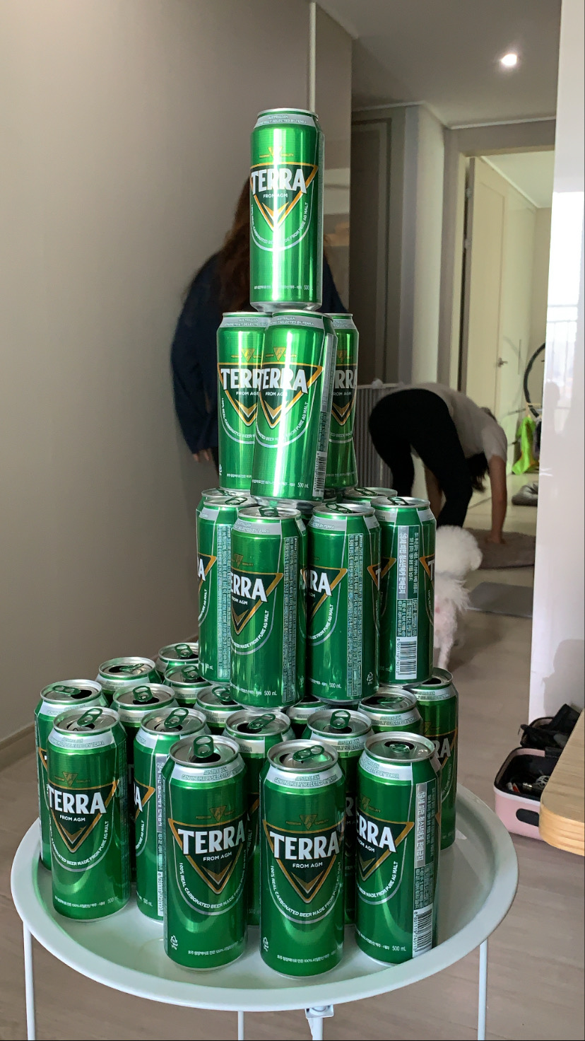 아침에 일어나니 어마어마한 맥주탑과 뒷배경 시선강탈 퐁이와 퐁이 친구 ㅋㅋㅋㅋ 어마어마하게 놀았다.. 우린 정말 자기자신을 놓고 놀아서 너무 재밌는 거 같아