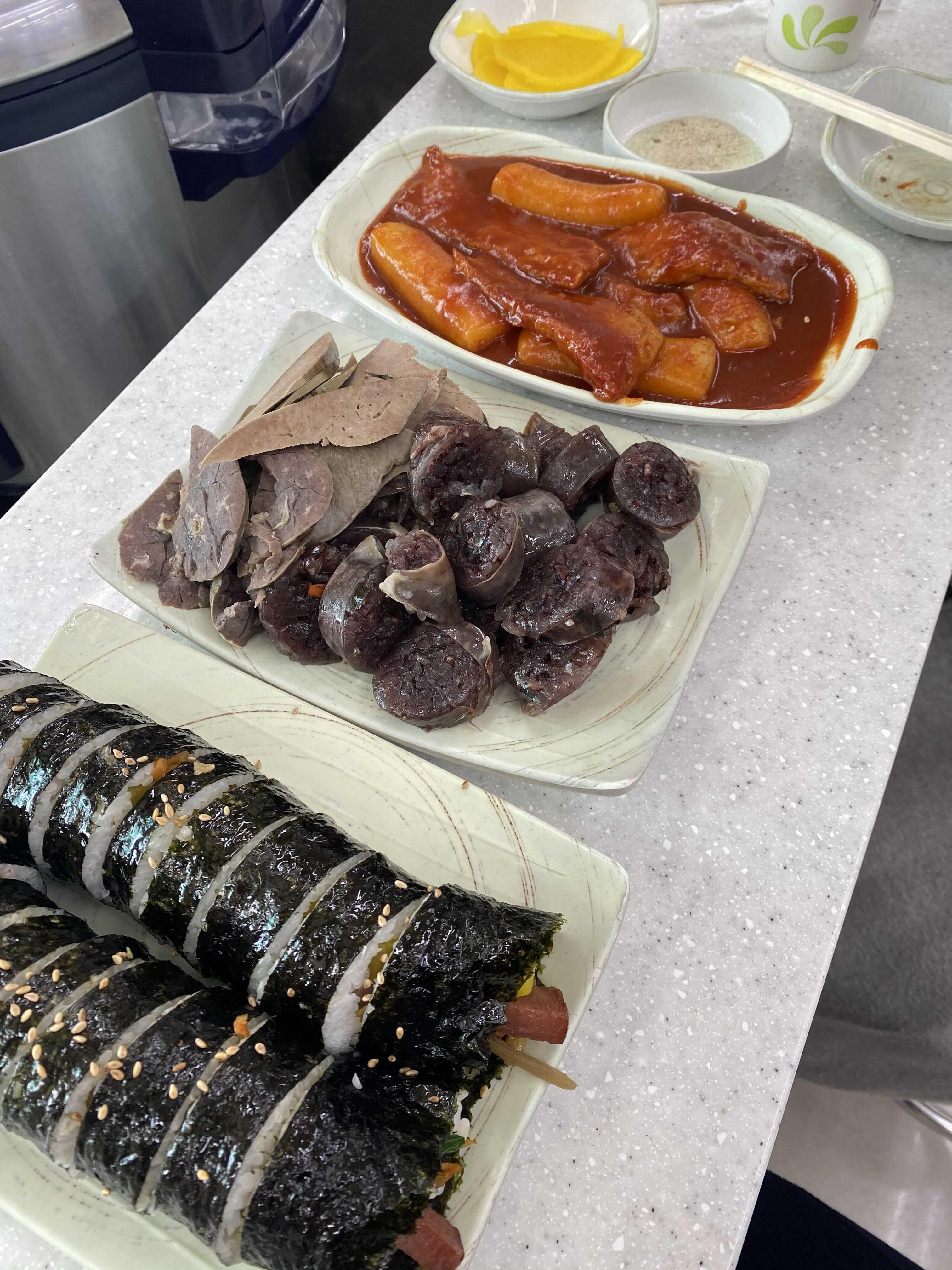 지영이가 맛있다고 해서 간 대백마트 김밥집, 순대랑 떡볶이가 눈 앞에 있는데 안 시키면 못 배운 여자 소리 들을까 봐;;; 가방 끈 긴 여자들답게 다 시켰어요 😆