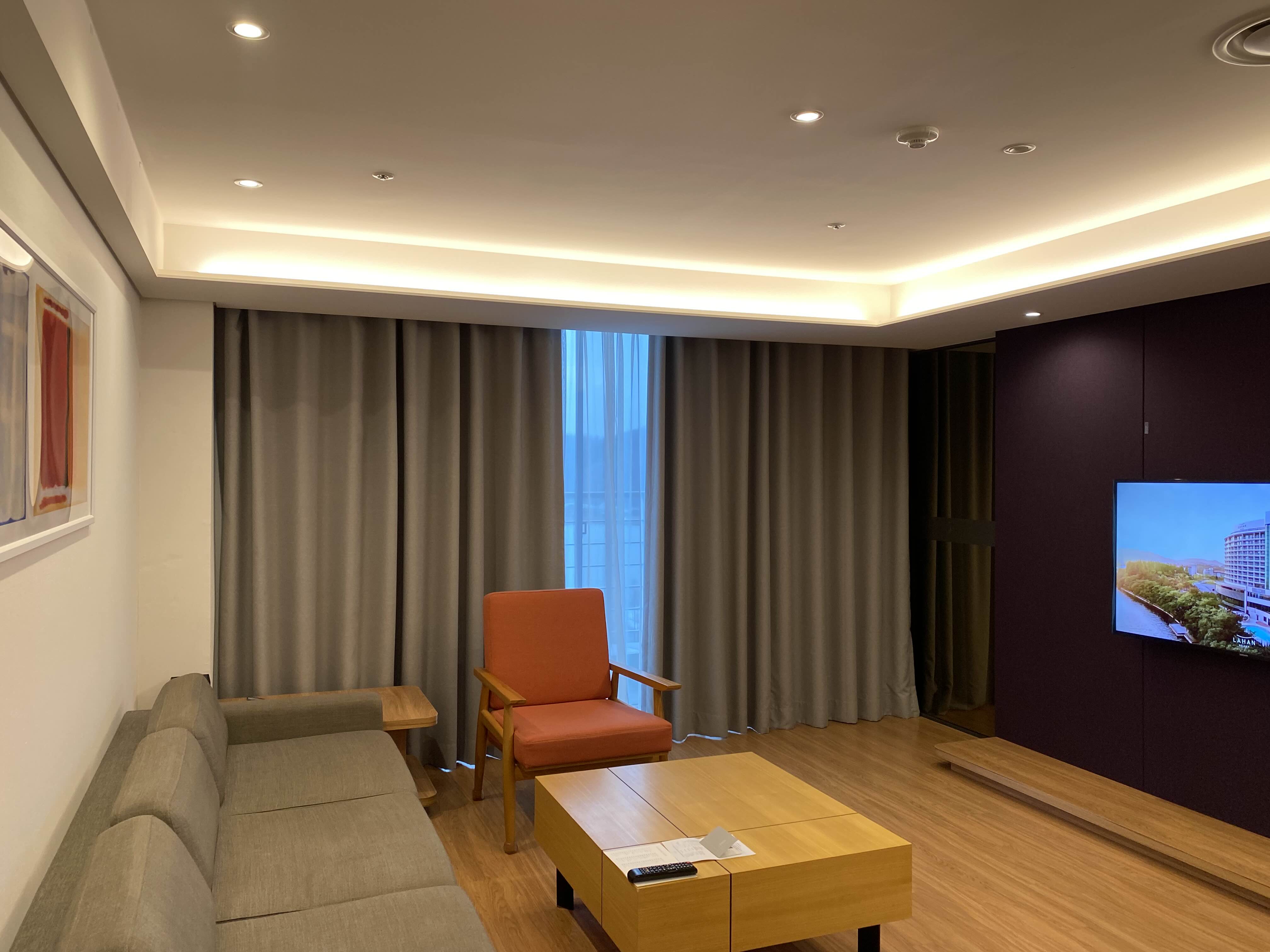 신발장 사진을 못 찍었는데, 문을 열고 오른쪽으로 들어가면 옷장과 신발장 그리고 전신거울이 있는 공간이 있어요. 그리고 짧은 복도를 지나면 이렇게 코너스위트룸 거실이 있고 TV가 있는 벽면은 보라색이에요. 미리 저기에 풍선이랑 이것저것 할 것들을 생각해 놓고 왔지요. 침실과는 유리문으로 열고 닫고 이동 가능합니다앙.