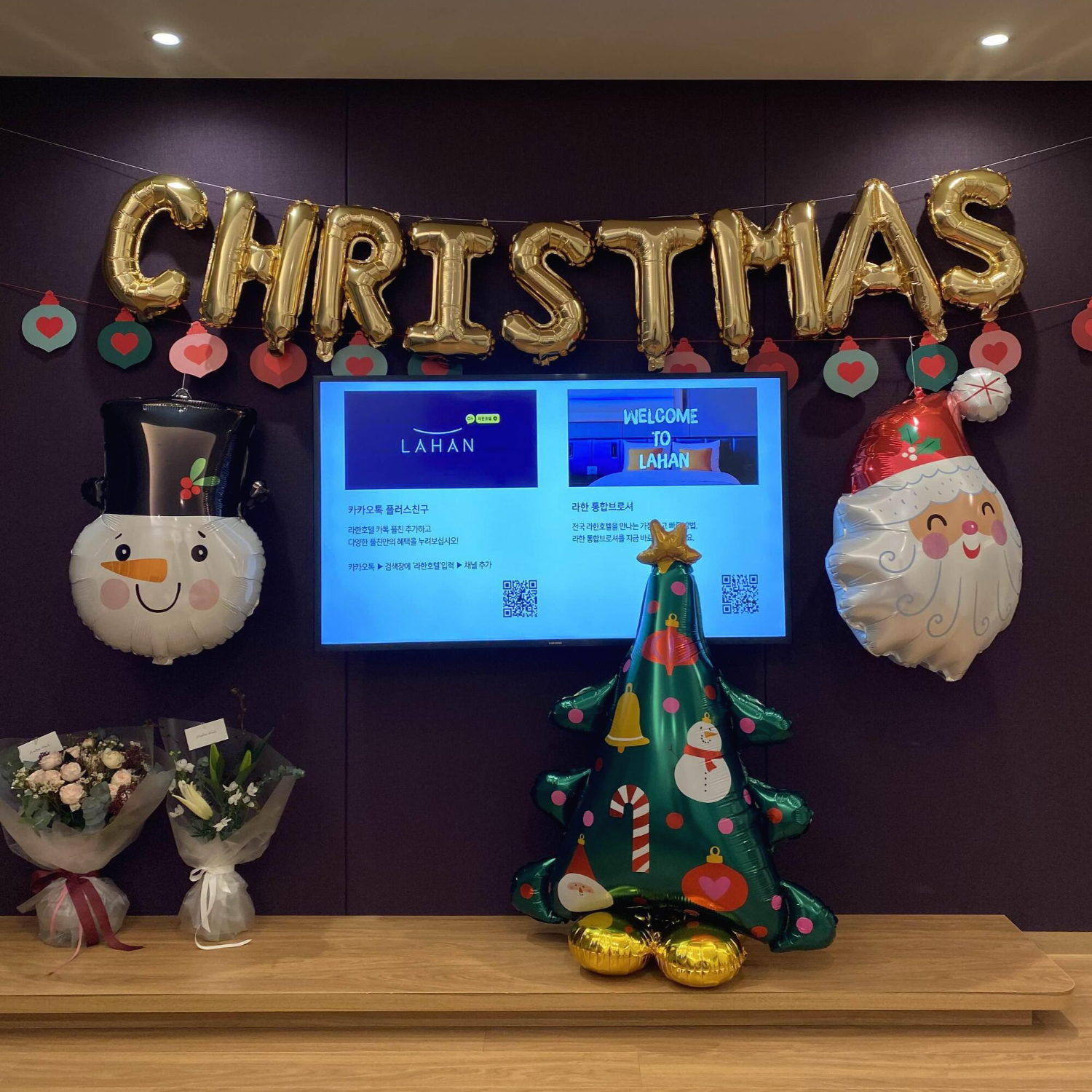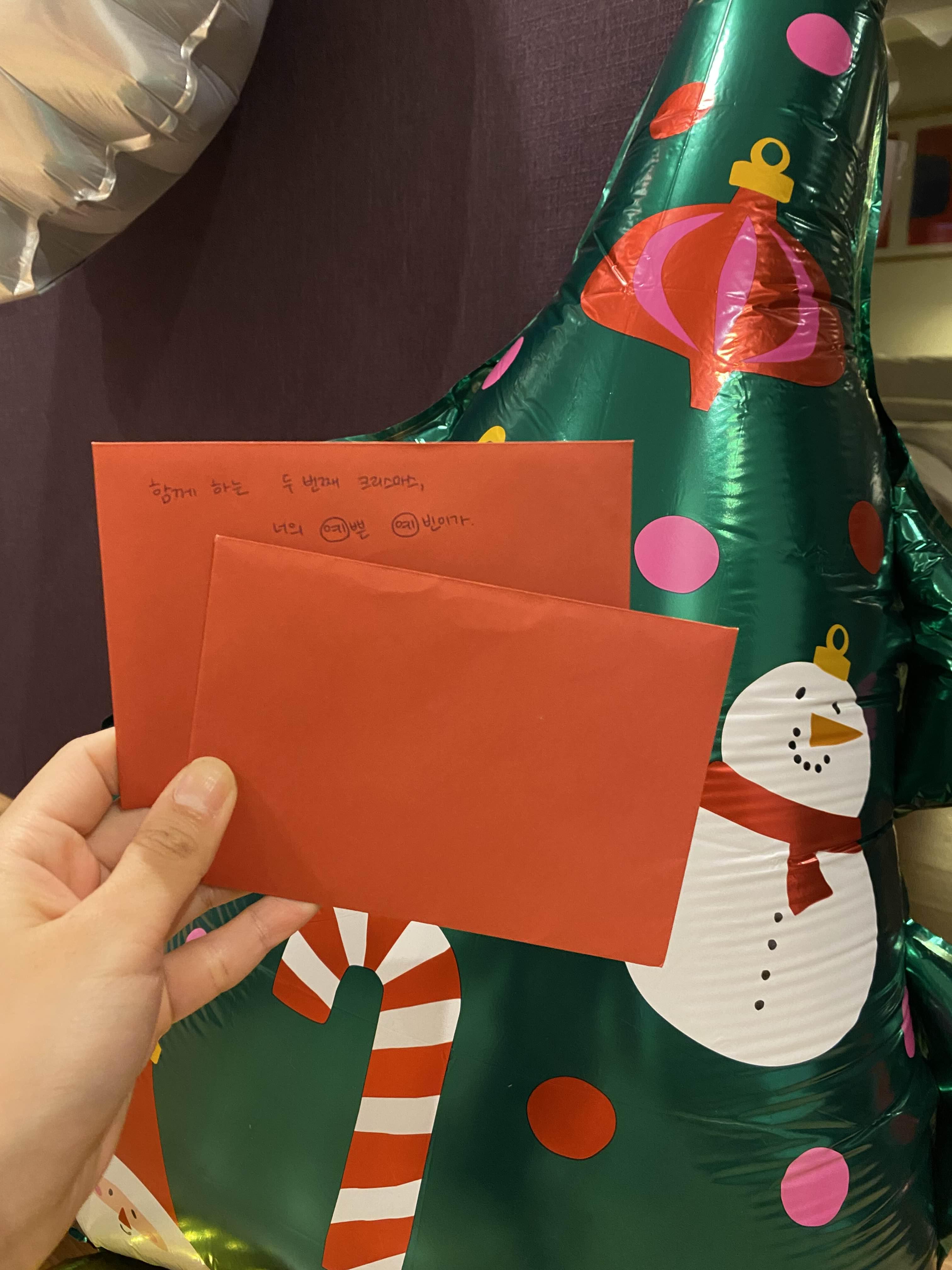 라운지에서 떡 먹고 배 채우고 다시 룸으로 돌아와 열심히 풍선 불기. 자기가 다 불어주겠다더니 결국 펌프로 (ㅋㅋㅋ) 펌프 없었으면 자기 오늘 죽었을 거라고.. 다 완성하니 정말 크리스마스 느낌 물씬. 🎈🎄🎀🎁⛄🎅🤶 고마워. 박싼타. 로맨틱. 성공적.