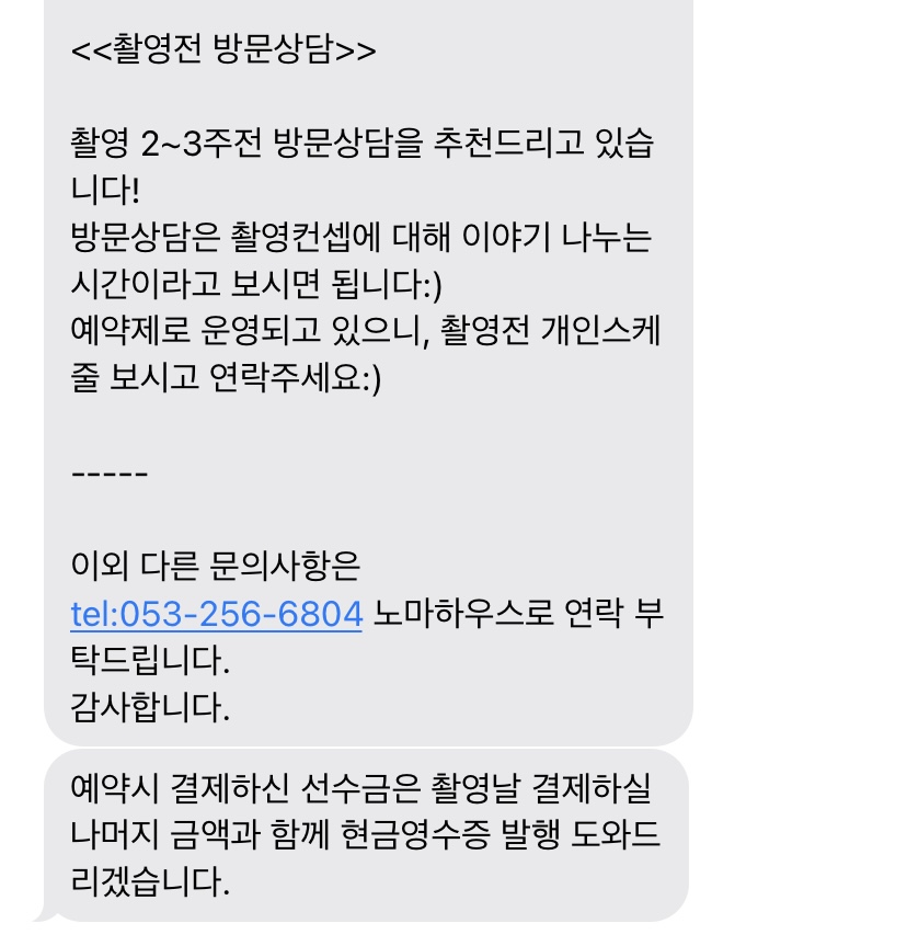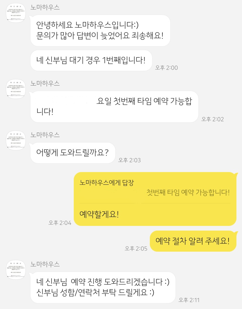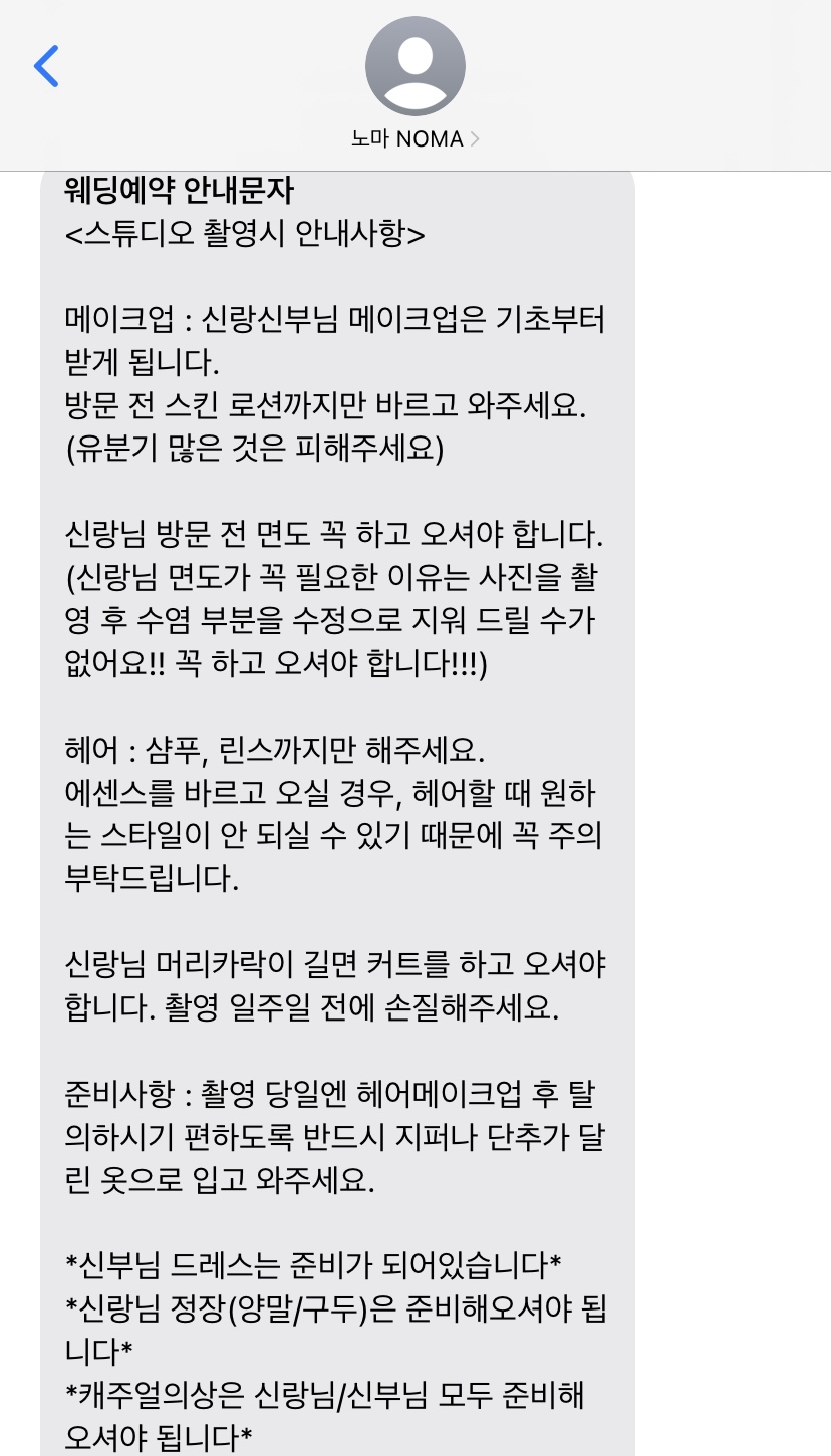 그리고 다음 날 대기 번호가 몇 번인지 궁금해서 다시 연락을 했는데 여전히 답변은 늦었다 :-) 근데 희망적이었던 건!!!!!!!!! 대기 번호 1번이었는데!!!!!!!! 답변을 주실 때 마침 촬영 가능한 날이 떠서 바로 예약을 했다. YES, I'm lucky girl. 1년 뒤 촬영인데 예약 성공한 걸로 이렇게 좋아해야 할 일인가 싶지만 원하는 걸 이루었으니 나는 그걸로 됐다.. 보통 다른 스튜디오들은 예약금이 50인걸로 알고 있는데 노마는 100이었다 ^_^.. 예약금을 입금하면 예약 안내 문자가 온다! 촬영 전에 상담을 하는 것까지 너무 좋았다.. 노벤저스 기대할게요.. 저는 남은 시간 동안 살을 뺄게요..?
