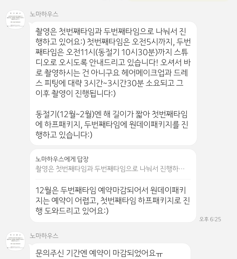 첫 번째 문의를 했을 때는 문의하고 하루 뒤에 답장이 왔다. 엄청나게 긴 안내문을 말해 주셨지만 결국은 문의한 12월 촬영이 예약 마감이 되었다는 말이었다.... 하..하..하.... 그래서 일단 대기를 걸어 놓았다. 하..하..하............